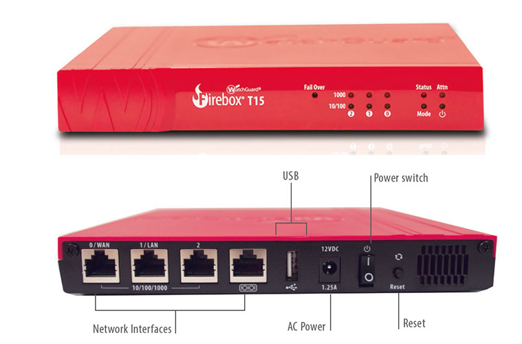 WatchGuard Firebox T15 - Up to 52 Mbps UTM full scan, 120 Mbps Firewall IMIX, 46 Mbps VPN IMIX, - 3 Gb Ethernet interfaces –Recommended for VPN and Network use cases